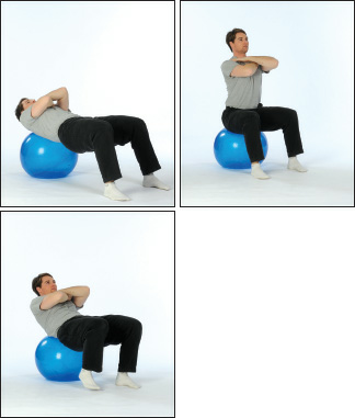 Position your hips on top of the physioball. Brace your core. Walk up the ball using your full foot. Keeping the feet wider adds stability if you feel off balance during the up or down phases.