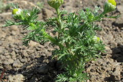 Pineapple weed is a low-growing erect annual plant that normally grows less than 15 cm tall but sometimes grows up to 30 ½ cm tall. The root system consists of a branching taproot. Stems are erect to semi-erect, ascending, smooth, and branched. Mature plant tends to be bushy when not subjected to competition. The plant is found growing in cultivated and abandoned fields, yards, gardens, roadsides, footpaths, compacted soils in farmyards, waste areas, open areas, bare disturbed areas and rural or urban waste grounds, railroads, irrigation ditches, stream banks, sandbars, cracks in the pavement, rubbish tips, shores, stony slopes of pastures, barnyards and edges of driveways and sidewalks.