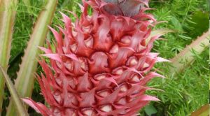 Pineapple is an herbaceous and perennial plant which measures 3.3 to 4.9 feet tall. Plant have short and stocky stem which bears tough and waxy leaves. The plant usually produces up to 200 flowers. When the first fruit is produced, side shoots form in the leaf axils of main stem. Leaves are long, trough shaped, narrow with sharp spine on margins which are 30-100 cm long encircling a thick stem. The color of the flower varies which depends on variety from light purple to red. It consists of many long pointed bracts having three petalled flowers in their axils. Flowers turn into fruits without being pollinated. Ovaries form into berries which is large, compact and multiple accessory fruit. Fruits are organized in two interlocking helices, eight in one direction and thirteen in other. Fruits have roughly diamond shaped with flattened sides.