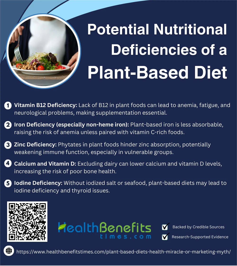 While plant-based diets offer many health benefits, they can lead to potential nutritional deficiencies in key nutrients like vitamin B12, iron, omega-3s, calcium, and protein if not carefully planned.