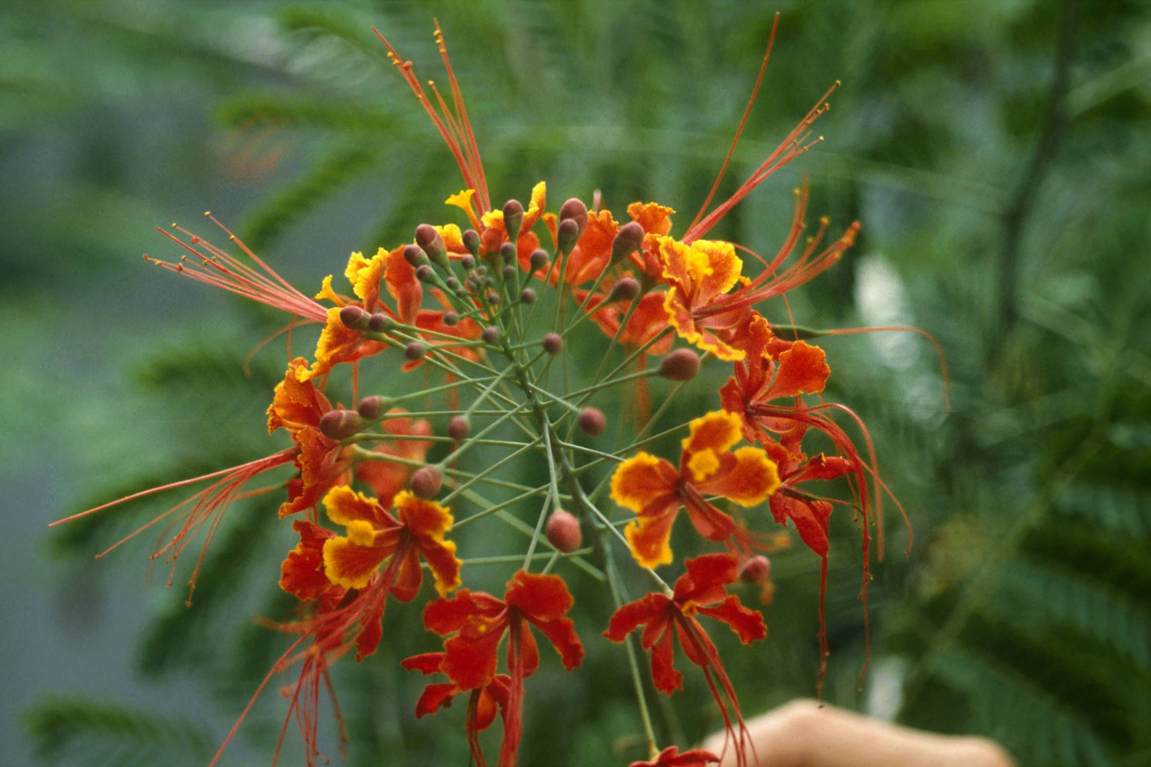 This summer bloomer adds vibrant and tropical effect with its medium green, ferny foliage and brilliant orange to red and yellow flower clusters. It is native to West Indies and Mexico. It thrives best in hottest places which bloom continuously during warm season. The shrub has large and feathery leaves. The plant attains the height of 1.5 to 6 meters in height and blooms flower by early summer. It is an evergreen shrub or small tree. Flower resembles peacock and are bowl shaped measuring 2 to 3 inches across with five crinkled, unequal orange and red petals. It is easy to grow in alkaline to acidic and well drained soils. It is fast growing plant and moderately tolerant of salty conditions. This shrub is tolerant to drought. Poinciana is also known as Barbados Flower-Fence, Barbados-Pride, Barbados Pride, Bird-Of-Paradise Flower, Dwarf Poinciana, Flower-Fence, Flower Crest, Flowerfence, Paradise-Flower, Paradise Flower, Peacock Flower, Peacock Tree, Poinciana, Pride of Barbados, Poincillade, Pride-Of-Barbados, Spanish Carnation, Red Bird of Paradise, Mexican Bird of Paradise and Flamboyant-de-jardin.