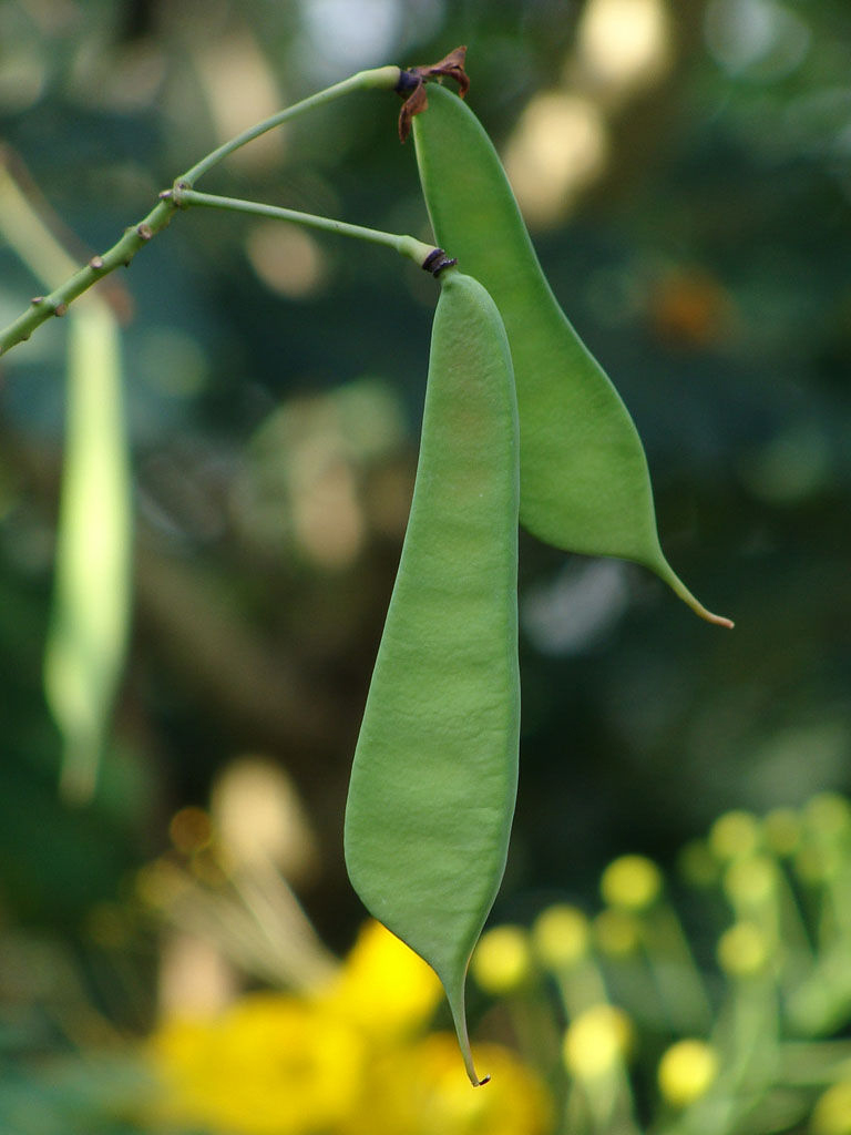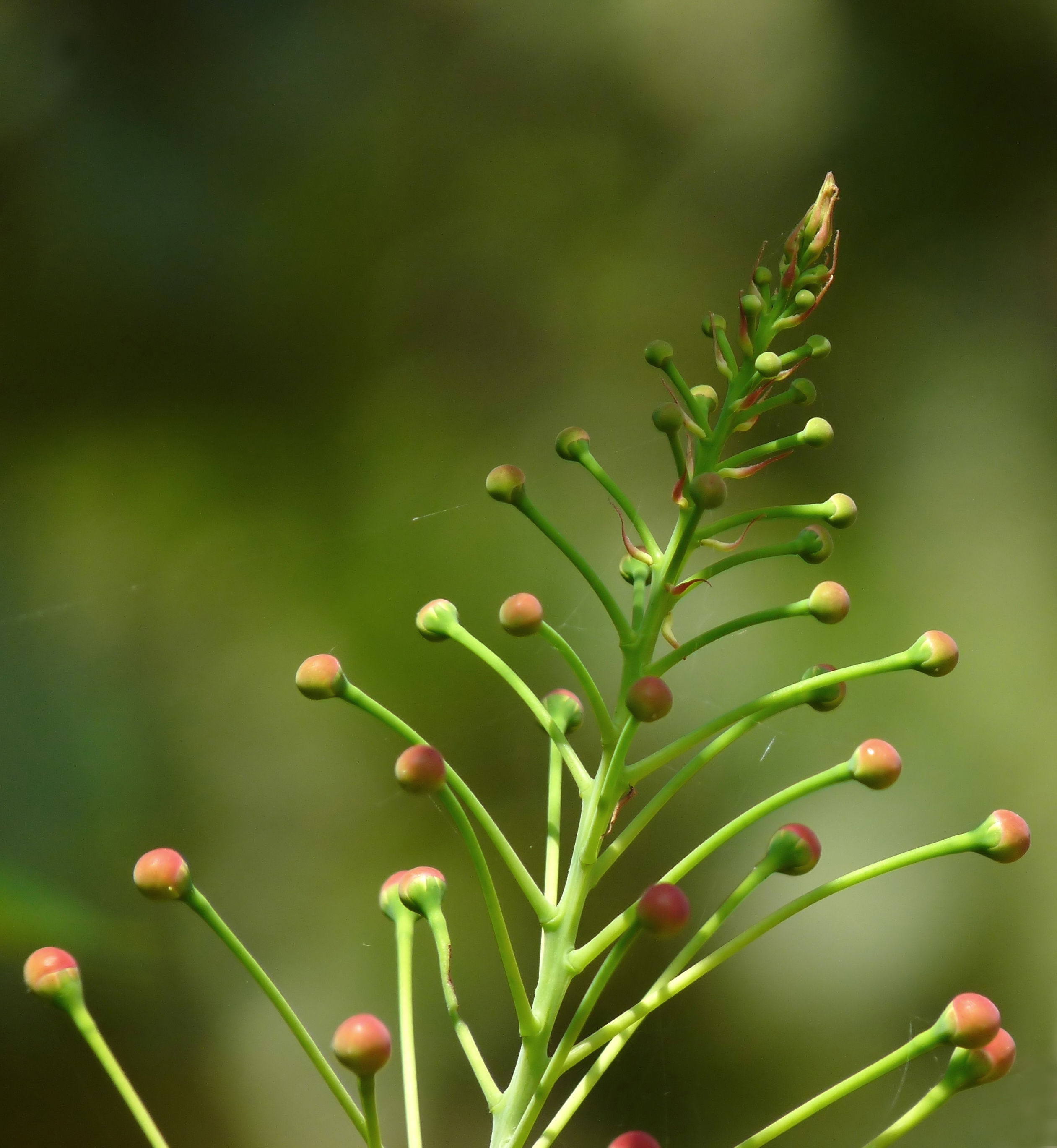 Caesalpinia pulcherrima is an erect, smooth much branched shrub or small tree which grows to the height of 1.5 to 6 meters high or branches unarmed or with few straight prickles. Leaves are paripinnate, alternate and 10 to 40 cm long with 5 to 9 pairs of pinnae. Inflorescence is 20 to 50 cm long in axillary and terminal raceme or panicle. Flowers are red, bisexual, orange, reddish to pink, orange, orangey to yellow and creamy or bright yellow. Sepals measure 10-15 × 5-7 mm. Petals are clawed and crisped measuring 10-25 × 6-8 mm. Pod is flat, nearly straight, compressed, smooth measuring 6 to 12 cm by 1.5 to 2 cm wide composed of 6 to 8 brown or black, rectangular seeds.