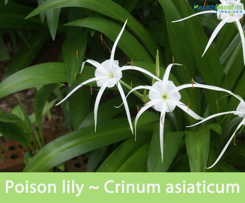 Poison lily or poison bulb is an erect, herbaceous, terrestrial, perennial, ornamental, bulbous plant with a flowering stalk in the center of the plant. The plant normally grows about 5 feet (1.5 m) tall and a greater spread of about 7 feet (2 m) from an underground bulb that can be 5 – 15cm in diameter. The plant is found growing in sandy beaches, other coastal areas, cliff and steep slopes, borders of coastal forests, mangrove forests and at low altitudes. The plant prefers a deep, well-drained but moisture-retentive fertile soil that is rich in organic matter. The plant has fibrous, adventitious root system and contracted, rounded and solid stem.