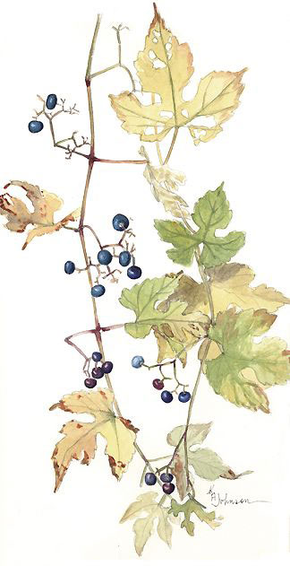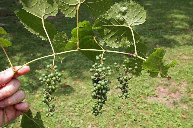 Woody vine to 4 inches (10 cm) diameter, climbing by tendrils with forked ends and fine hairs (tendrils not forked on native grapes). Tendrils occur on new growth, opposite leaves. New stems are whitish green, smooth to lightly hairy, slightly square with regularly spaced swollen nodes, increasingly with raised dots (lenticels) that become corky and reddish, eventually forming linear gray-reddish barky patches. Bark glossy light gray becoming gray and rough with persistent swollen nodes. Pith is white, while native grape pith is brown.