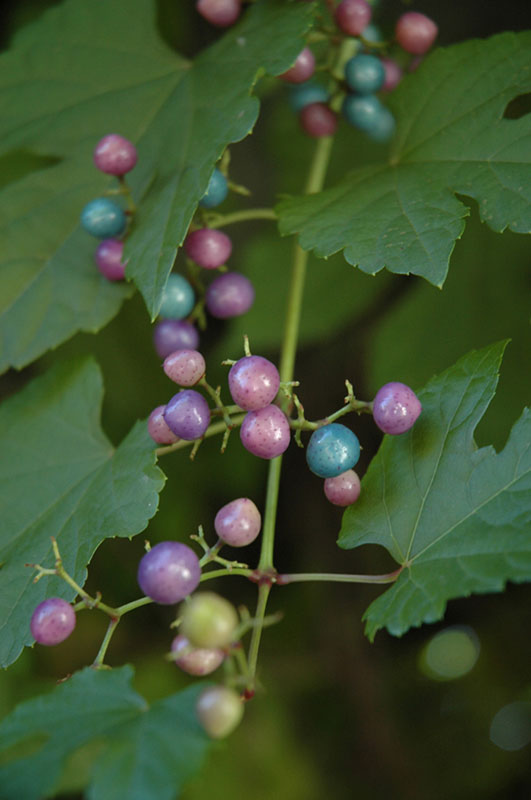 Fertile flowers are followed by clustered drupes, shiny, spherical, to 0.5 inch (1.2 cm) wide, green tipped with a persistent pistil and turning whitish, yellow, purple, turquoise, and porcelain blue (thus the common name), with all colors sometimes present.. Each fruit contains 2-4 seeds and each plant can contain hundreds of berries. The fruits appear in between September and October.