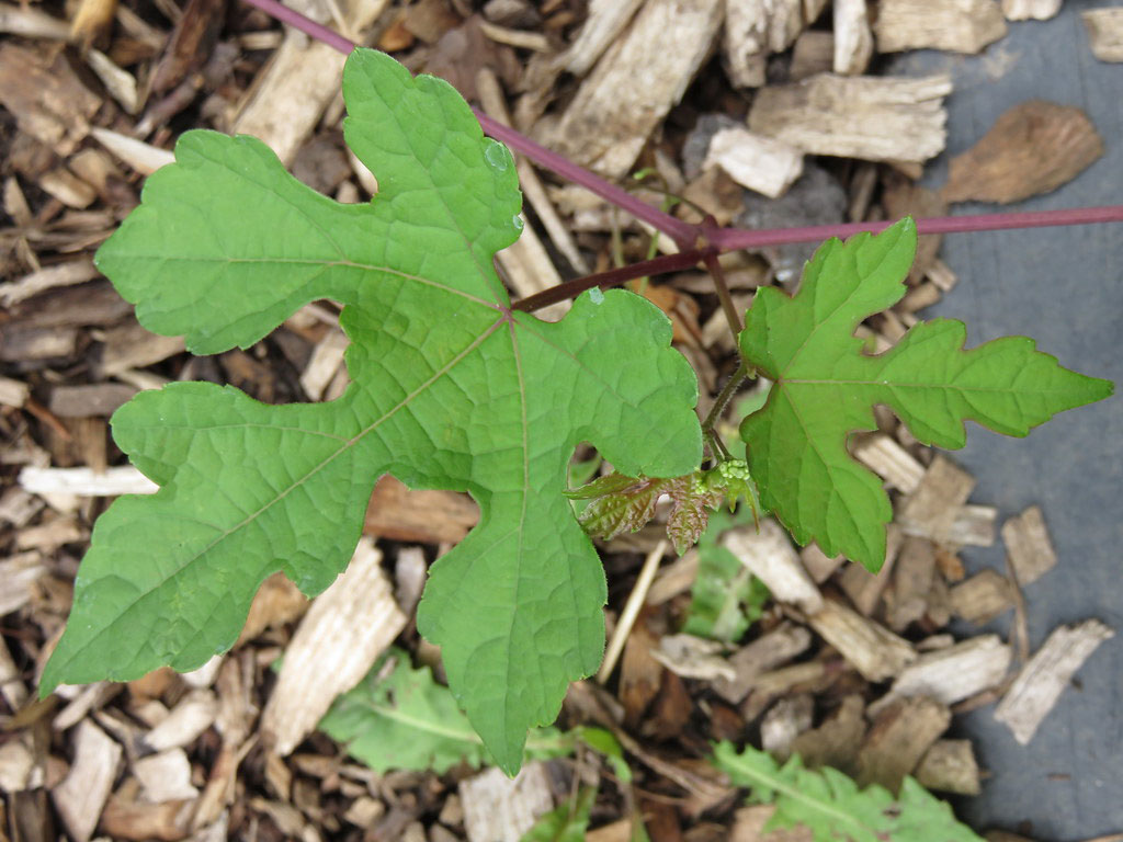 Leaves are alternate, simple and heart shaped in outline but variable in form from entire with 1 to 3 tips to those with multiple incised, rounded to scalloped lobes between 3 to 5 prominent whitish veins radiating from the base. Margins are coarsely toothed with distinctive fine whitish hair tips. They are dark green to blue green, shiny above and fine hairy beneath, becoming yellow in fall. New leaves are tiny at branch tips, progressively increasing up to 6 inches (15 cm) long and 4 inches (10 cm) wide. Petioles are 2.5 inches (6 cm) long; light green and hairless, with greatly swollen bases. The plant climbs by tendrils that grow opposite the leaves on the stem.