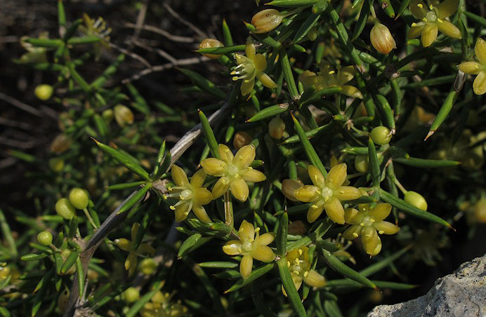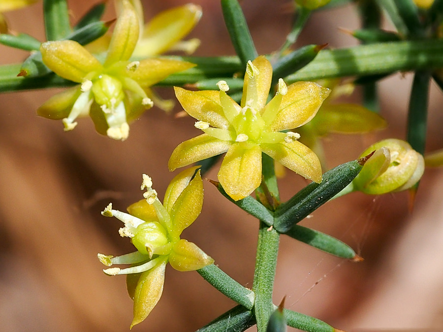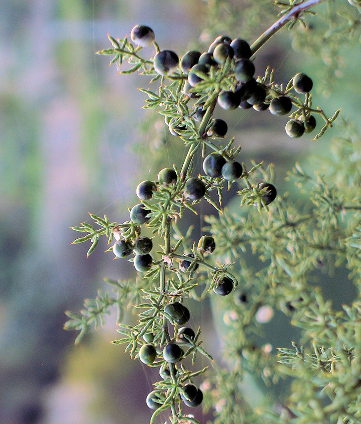 The plant has small, thin, green, aciculate leaves. Flowers are small, yellowish-green, axillary, in groups of 3 to 6, short compedicelo. The male flowers have six stamens erect and robust with yellow anthers. The female flowers have a short stigma with a slightly swollen style. Flowering normally takes place from September, October and November. Flowers are followed by spherical, small and hard, 7-8 mm berries in maturation with 1 to 3 seeds.Fruits are initially green turning to reddish and finally black as they mature.