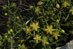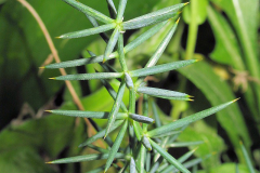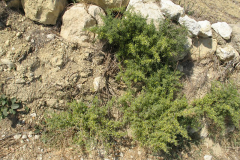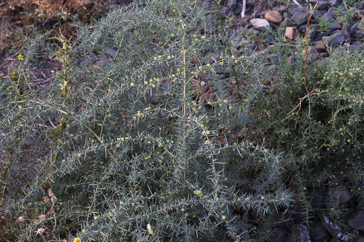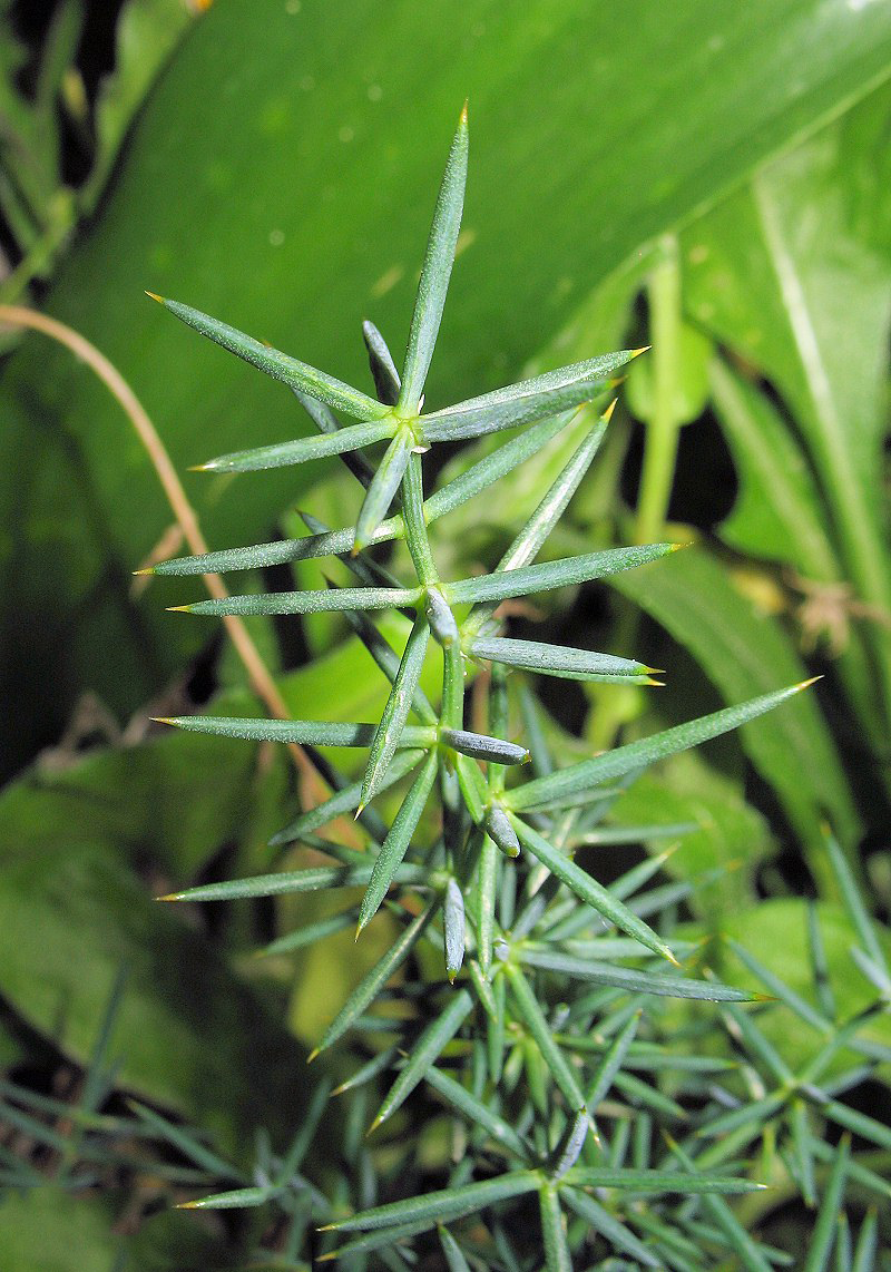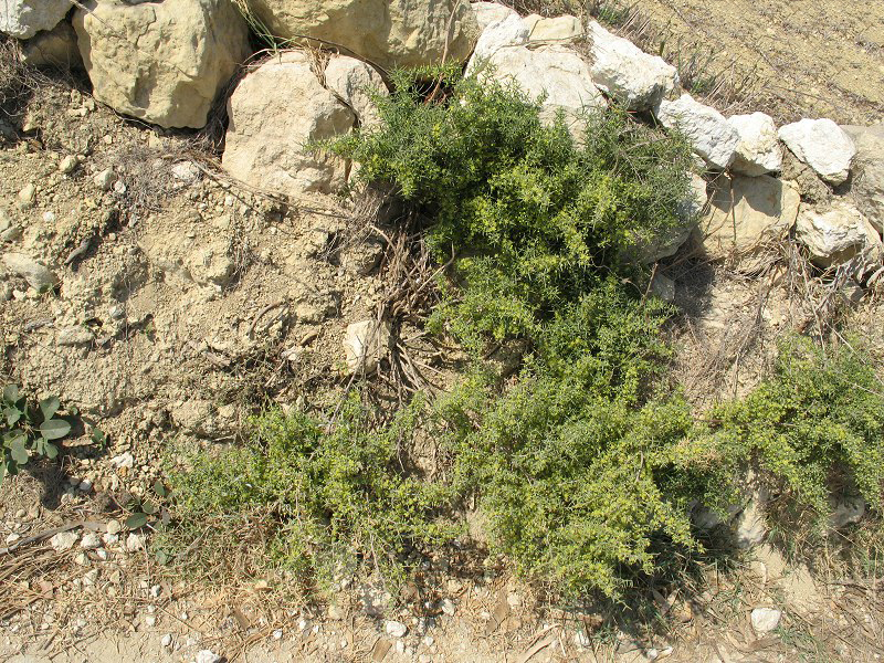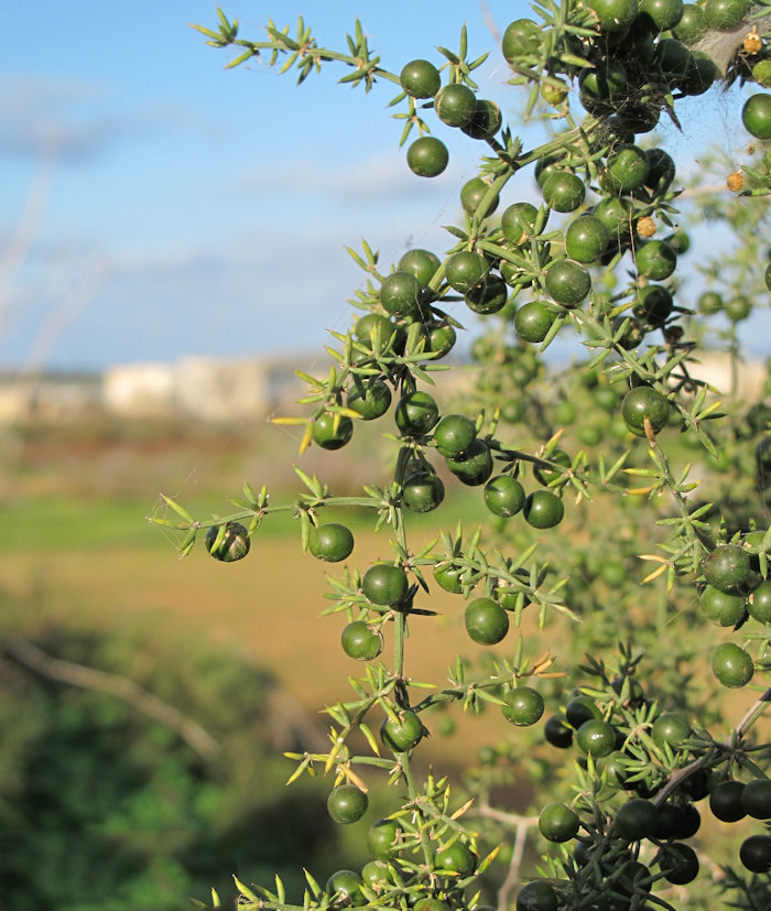 Prickly Asparagus is a much-branched, rhizomatous, perennial plant that grows about 40 – 80 cm tall. It is found growing in xerophilous woods,shrub lands, hedges, forest edges, coastal dunes, accompanying thickets of camarinha, zimbrais, psamófilos tojais, woodlands, semi-steppe shrub lands, hedges and rocky limestone hills. The plant prefers a rich sandy loam. The plant has tuberous roots. Cladodes are stout and very sharply tipped unequal in length, from 5 to 20 mm long, in clusters of 3 to 7. Stem is thin, woody and very tough. Stalks and branches are smooth and scabrous, green. Spur is 1.5-3.5 mm, applied,thorny.