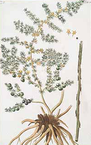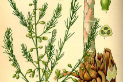 Culpeper described both types of asparagus as being under the influence of Jupiter: “The young Bud or branches boiled in one ordinary broth, makes the Belly soluble and open, and boiled in white Wine, provokes urine being stopped, and is good against the Strangury, or difficulty of making water. It expels the gravel and stone out of the Kidneys, and helps pains in the Reins: And boiled in white Wine or Vinegar it is prevalent for them that have their Arteries loosened, or are troubled with the Hip-Gout, or Sciatica.The Decoction of the Roots boiled in Wine and taken is good to clear the sight,and being held in the Mouth eases the Toothache: And being taken fasting several mornings together stirs up bodily lust in Man or Woman (whatsoever some have written to the contrary.) The Garden Asparagus nourishes more than the wild; yet hath it the same effects in all the aforementioned Diseases. The decoction of the Roots in white Wine, and the Back and Belly bathed therewith,or kneeling or lying down in the same, or sitting therein as a Bath, hath been found effectual against pains that happen to the lower parts of the Body; and no less effectual against stiff and benumbed Sinews, or those that are shrunk by Cramps, and Convulsions, and helps the Sciatica.”