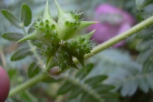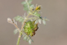A week after each flower blooms, it is followed by a fruit that simply falls apart into 5 nutlets or burs. The nutlets are hard and bear 2-4 sharp spines, 10 mm long and 4–6 mm broad point-to-point. These nutlets amazingly resemble goats’ or bulls’ heads; the “horns” are sharp enough to puncture bicycle tires and lawn mower tires and to cause painful injury to bare feet. Within each nutlet, seeds are stacked on top of each other, separated by a hard membrane. As an adaptation to dry climates, the largest seed germinates first, while the others may wait until more moisture is available before germinating.