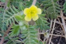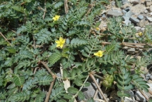 A network of fine rootlets arises from the taproot of Puncture Vine plant to take advantage of soil moisture, by which the plant can survive in very arid conditions. Stems release from the crown to a diameter of about 10 cm to over 1 m, often branching. They are usually prostrate, forming flat patches, though they may grow more upwards in shade or among taller plants. Stems branch from the crown and are densely hairy. Leaves are opposite and pinnately compound. Densely hairy leaflets are opposite and up to 1⁄8 inch (0.0032 m) long. The flowers are 4–10 mm wide, with 5 lemon-yellow petals, 5 sepals, and 10 stamens. In Southern California, it blooms from April through October, where it is highly invasive in waste places and disturbed sites.