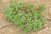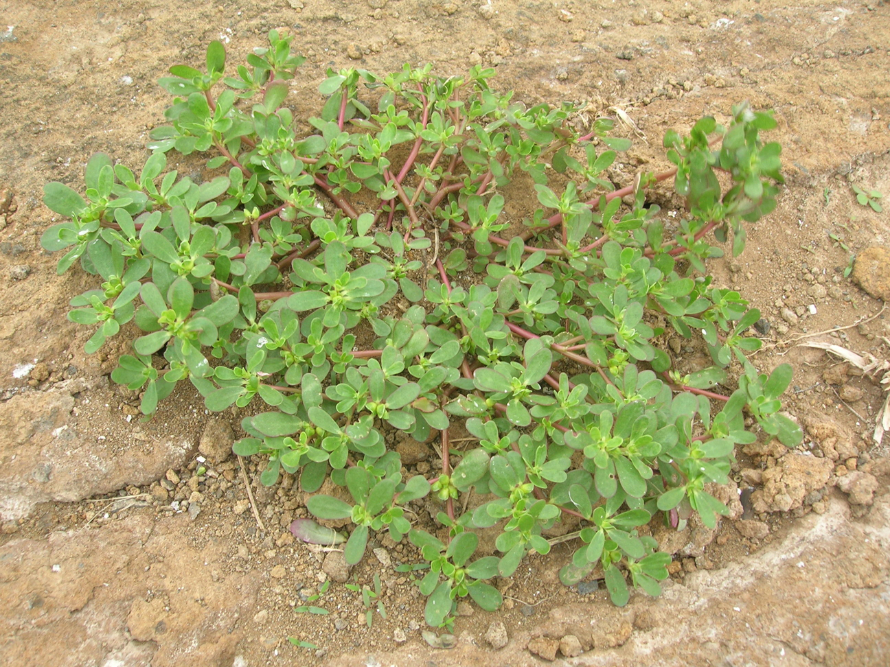 Purslane is a green, leafy vegetable that can be eaten raw or cooked. It is a succulent annual trailing plant sized 40 centimeters (16 in) in height. It prefers comparatively less water and soil nutrients and grows well sunny climates and can thrive in all soil types. It is often found thriving in the cracks of sidewalks and driveways even during summer’s heat. It often pops up in container gardens, flowerbeds, gardens, fields, waste ground and roadside. Purslane plant has taproot with fibrous secondary roots and is able to tolerate poor compacted soils and drought and fleshy or watery, smooth, reddish-green to purplish-red stem repeatedly branched and often forming circular mats 30-60 cm (1-2 ft) in diameter or larger. Leaves are small, oblong, wedge shaped and dark green colored. Flowers are small, yellow, solitary or clustered, stalk less, placed above the last leaves on the branches and are up to 6 millimeters (0.24 in) wide and are found blooming during June and July. Flowers later produce small green, egg or a pear-shaped seed capsule that consists of nearly oval seeds that are wrinkled, and black with a whitish scar at one end.
