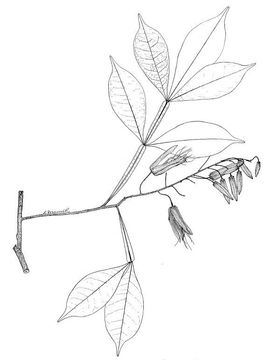 Leaves are compound and alternate, 15–25 cm long, pointed at the apex narrowed toward the base, and pinnate with 3-5 leaflets, the leaf rachis being winged. The leaflets are opposite, oblong, acuminate and uneven at the base.