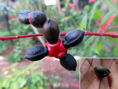 Small drupe 1-1.5 cm long, black, shining, solitary, globose, with a thin shell. |