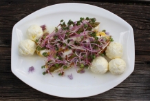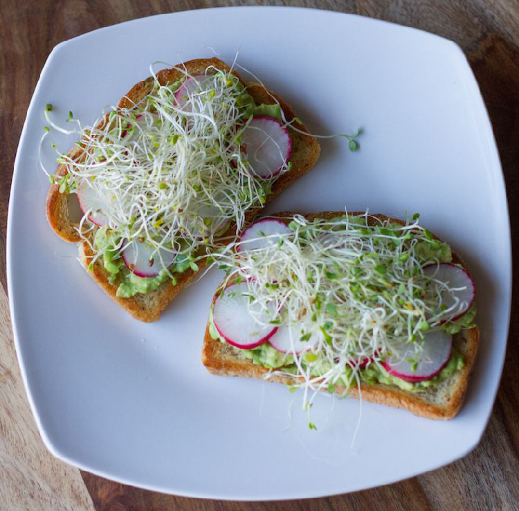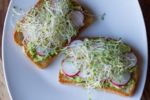 To prepare these sprouts, soak 3 tablespoons alfalfa seeds and radish seeds for 8–12 hours. Drain and rinse. Then transfer the seeds to a sprouter. Sprout for 5 days, and rinse the seeds two or three times a day. Rinse the sprouts to remove the hard hulls and they are ready to use.