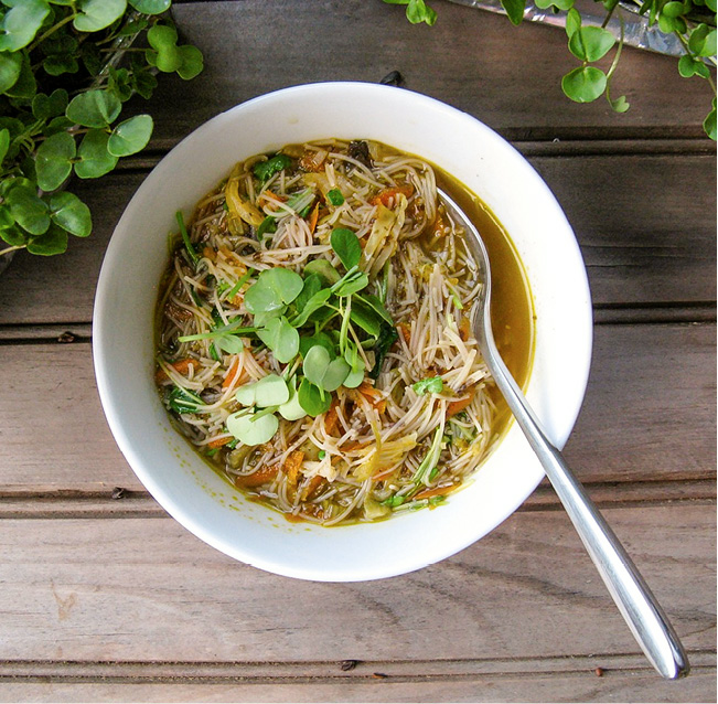 Simmer until veggies are cooked through. Add enough water to cover the veggies, plus another 2 to 3 inches (5.1–7.6 cm). Bring to a boil and add rice noodles, rice vinegar, kudzu, maple syrup, and soy sauce or tamari. Cook until noodles are tender.