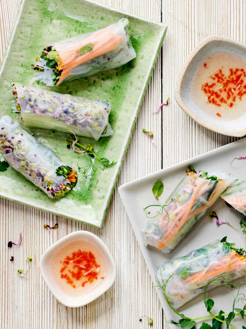 Soak 1 rice paper wrapper in a bowl of warm water for 10–15 seconds. Once soft, place wrapper on a clean, damp tea towel. On the bottom third of the paper, make a rectangular pile of 1 tablespoon of the noodles and equal quantities of the vegetables, sprouts, and shoots, leaving ½ inch (1cm) of space on each side. Top with a sprinkle of chopped herbs.
