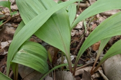Allium tricoccum is a bulbous, perennial herbaceous monocot plant that normally grows about 20 – 30 cm long and a flowering scape 10 – 40 cm tall from an underground bulb. The plant is found growing in rich woods and bottoms, slopes, stream sides, beech and maple woods, rich forested mountainsides, rich cove forests, northern hardwood forests and other mesic slopes, mesic deciduous woodlands and wooded bluffs. The wild leek’s root system comprises an ovoid bulb having fibrous roots at the bottom. Often offsets develop and they produce clonal colonies of wild leek.