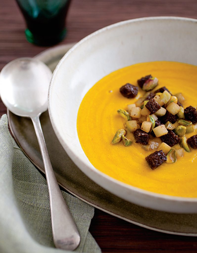 Squash is such a good flavor absorber that I keep coming up with new things to do with it. With a little imagination and the ingredients in your fridge, you likely have the makings of a good squash soup. The combination here works as a complete meal, especially for, say, lunch on a cold winter weekend. The black bread croutons add crunch and body, and the apples call up hints of a savory apple crisp. For a heartier meal, skip blending the squash and serve it roasted, alongside duck breast or turkey leg. You can also substitute cauliflower for the acorn squash.