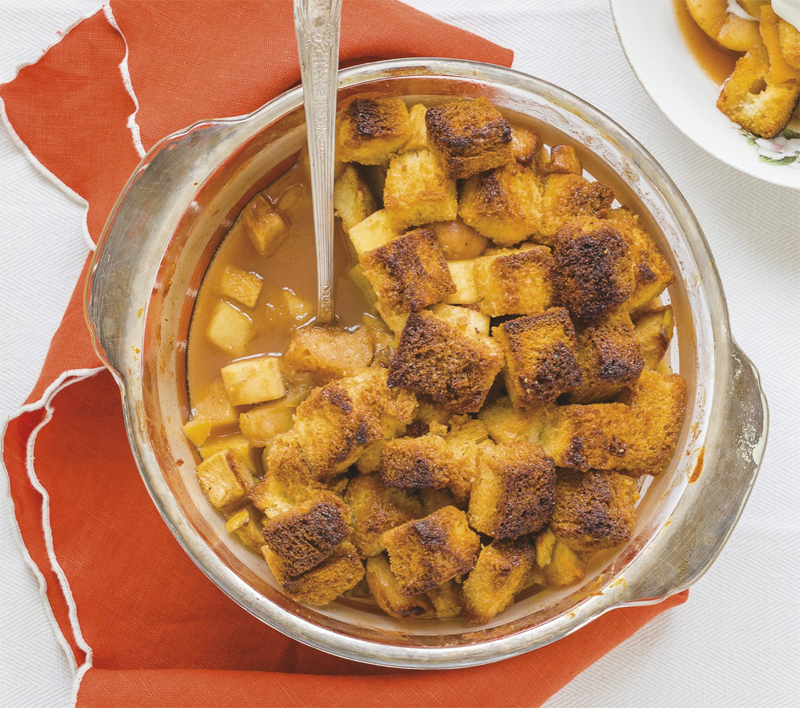 - Arrange the bread cubes on top of the apples and bake until the juices have begun to bubble and the bread cubes are caramelized, about 1 hour. Serve warm.