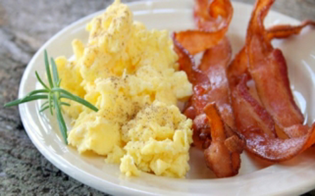 - Keep stirring until it turns brown. When the onions and bacon are cooked, add in the egg whites and scramble it altogether. Sprinkle with pepper and salt and serve with lettuce.