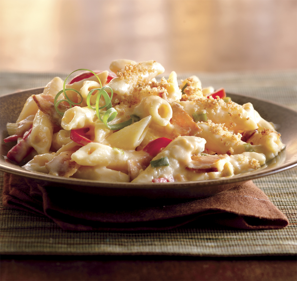 - In 3-quart saucepan, melt butter over low heat. Reserve 1 tablespoon of the butter in small bowl. Stir bell pepper and onions into butter in saucepan. Increase heat to medium; cook and stir 1 minute. Stir in flour, salt, pepper and mustard. Cook and stir until mixture is bubbly. Increase heat to medium-high. Gradually add milk, stirring constantly, until mixture boils and thickens, about 5 minutes. Gently stir in bacon and pasta. Remove from heat; stir in cheeses until melted. Pour into casserole.