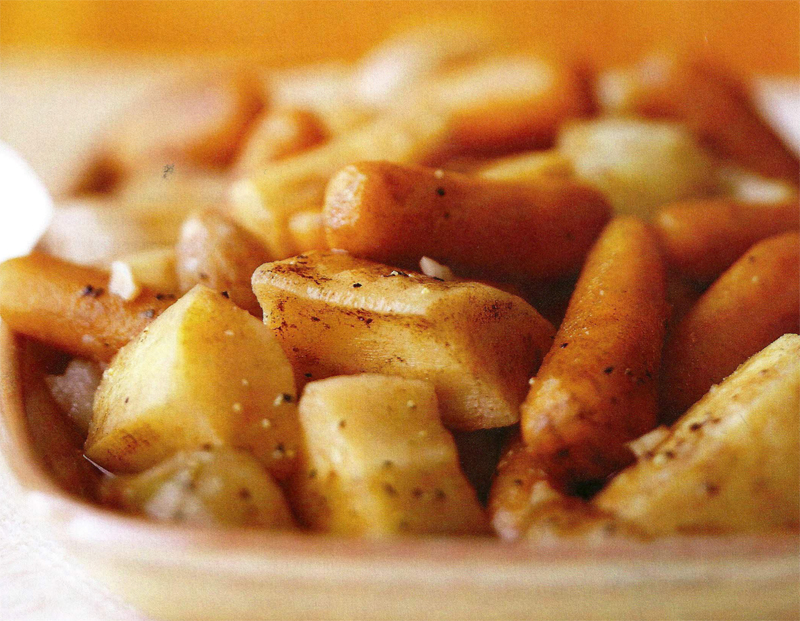 - Combine potatoes, parsnips, carrots, onions, broth, vinegar, brown sugar, salt, pepper, and garlic in a 3½ or 4 quart slow cooker.