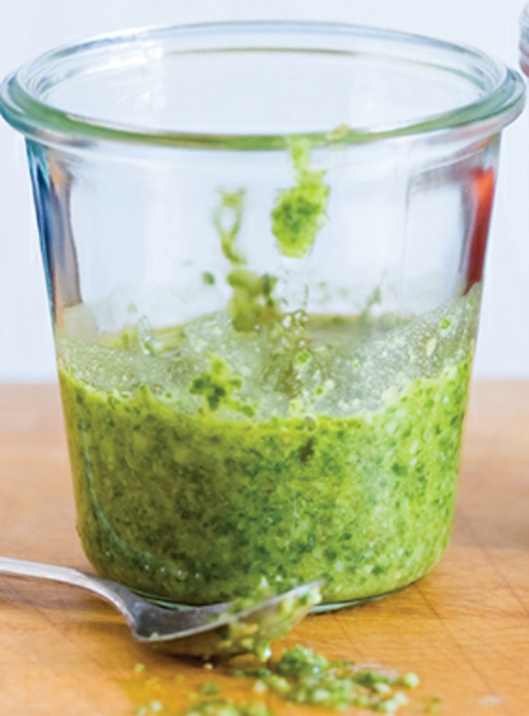 - Put the basil, 1 cup olive oil, pine nuts, Parmesan, and lemon juice in a food processor. Add the garlic and its cooking oil and process until smooth. The pesto should be thick but spreadable. If it’s too thick, add more olive oil; if it’s too thin, add more cheese.
