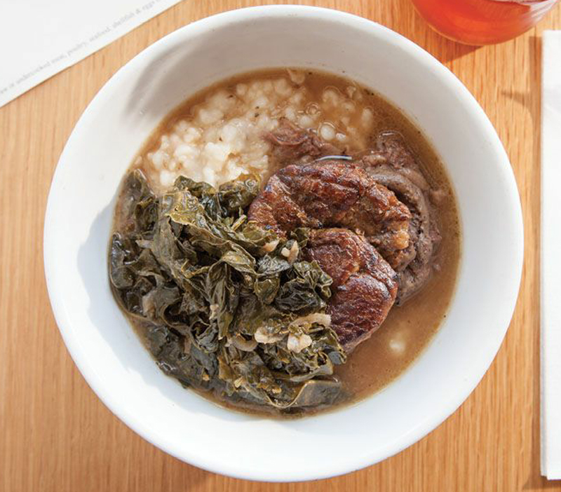 - In a bowl, add the Grits, Braised Pork, and stock. Garnish with either grilled onions or a heavy braising green such as black kale.