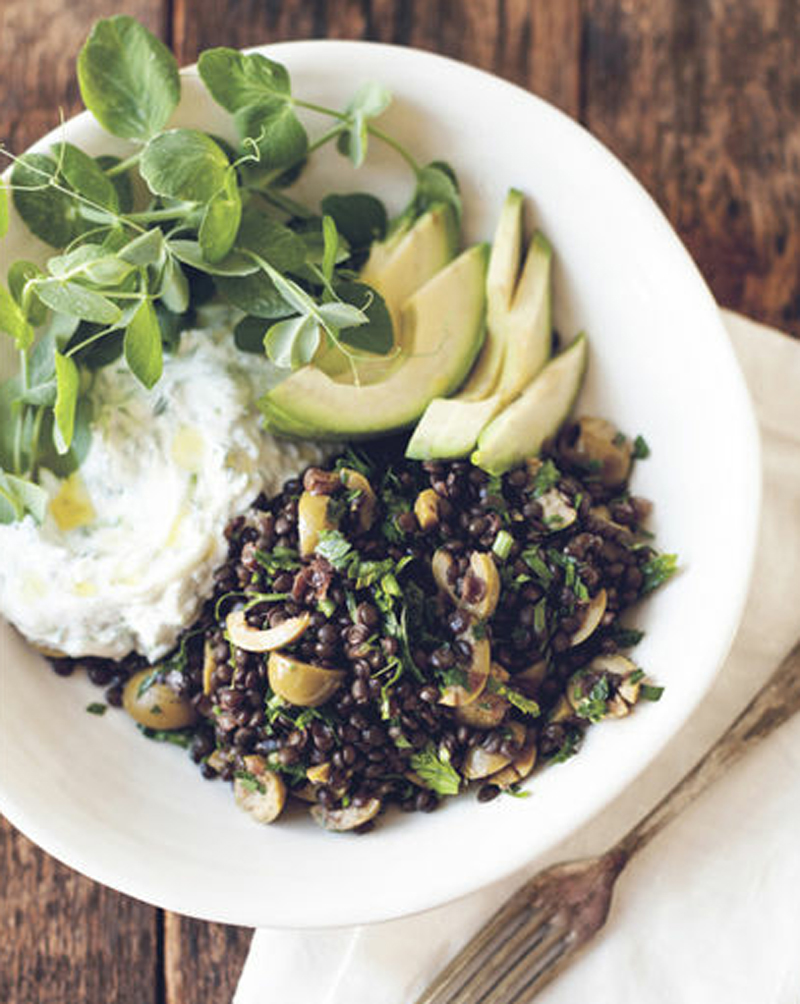 - To serve, put a few spoonfuls of lentil salad on each plate. Top each serving with slices of avocado, some pea shoots, and a generous dollop of tzatziki. Drizzle with extra olive oil if desired.
