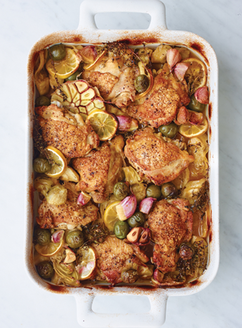 - Preheat the oven to 375°. Season the chicken all over with salt and pepper. In a large cast-iron skillet or black steel pan, heat the oil. Add half of the chicken skin side down and top the pieces (not the pan) with a pot lid; cook over moderate heat until browned and crisp, 5 to 7 minutes. Transfer skin side up to a large baking dish. Repeat with the remaining chicken. Scatter the artichoke hearts, olives, garlic, lemon slices and thyme in the baking dish.