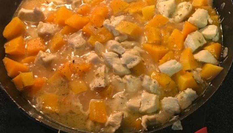 - Heat the oil in a heavy large nonstick frying pan over medium heat. Add onion and sauté until tender, about 5 minutes. Add the garlic and sauté for just a minute. Add the cubed chicken and cook through. Add squash, rosemary and sauté for 8 to 10 minutes. Add the broth and bring to a simmer over medium-high heat. Decrease the heat to medium-low and simmer until the squash is tender and the liquid is reduced by about half, stirring occasionally, about 10 minutes. Season, to taste, with salt and pepper.
