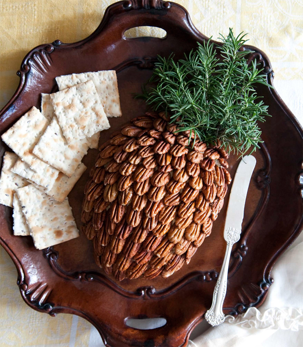 - Loosely unwrap the cheese ball and let it sit at room temperature about 20 minutes. With the tip of the oval facing downward, work from the bottom up to place pecan halves in overlapping tile fashion to mimic a pineapple’s exterior; add rosemary sprigs for the “crown” before serving.