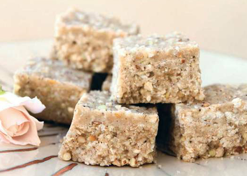 - Add remaining ingredients to the food processor, and mix until they start to form a loose dough. Test the dough between your fingers to see if it sticks together; if it does, then you are ready to roll it into bars. Add more honey if needed.