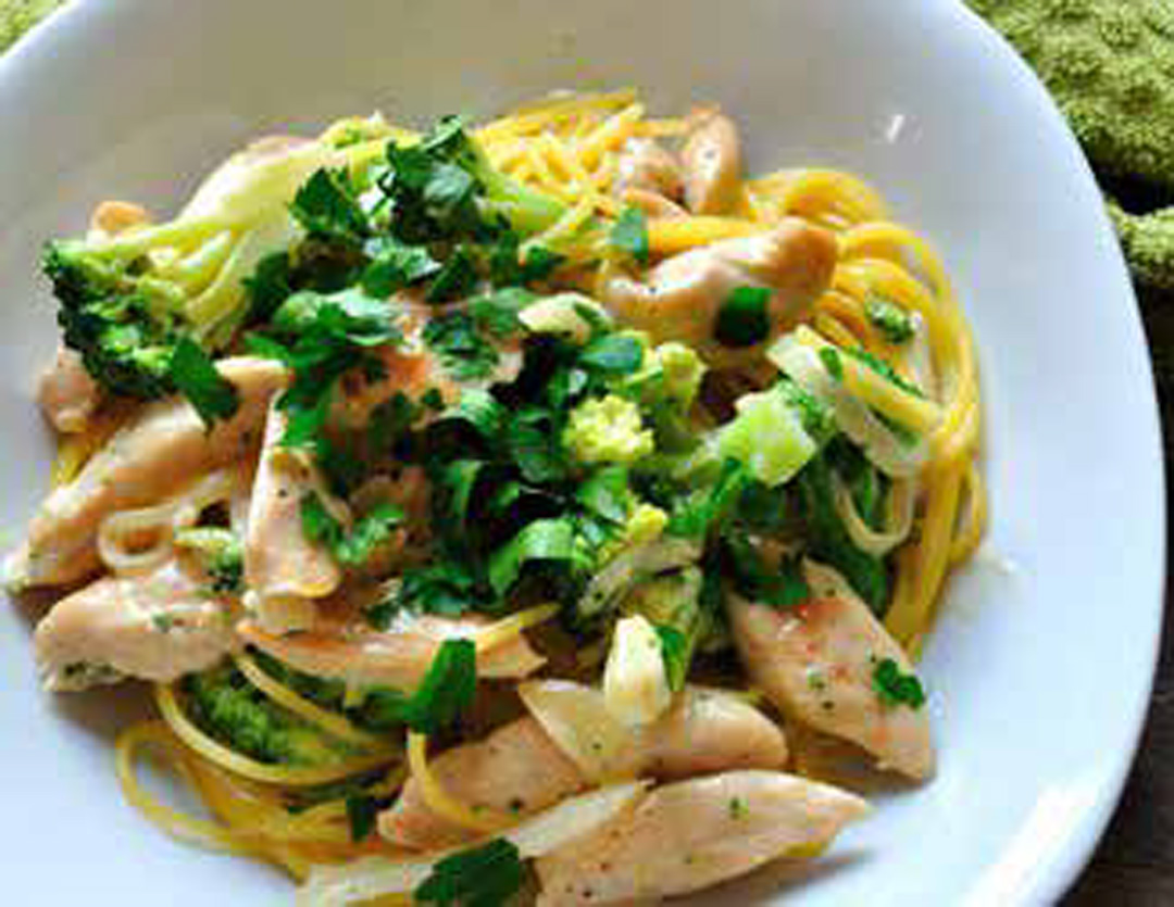 - Add the chicken and broccoli back into the pan and bring to a simmer. Toss in the gluten-free fettuccini and parsley and season with additional salt and pepper, if desired.