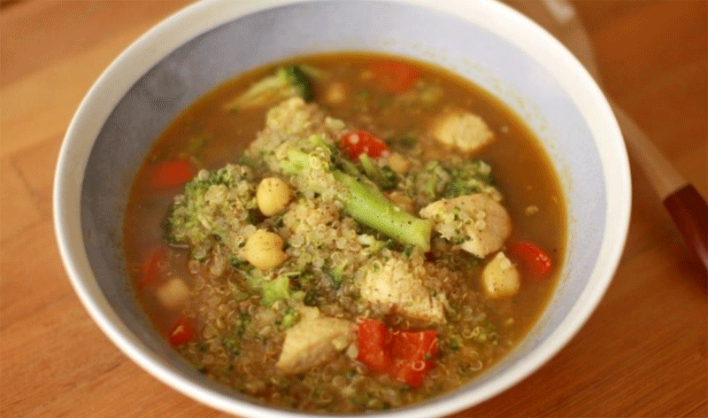 - Put all the ingredients in large and deep bottom pan. Pour in 1 quart of water and cover the pan with a lid. Let it simmer over low heat for 40-45 minutes or until chicken and chickpeas are cooked through.