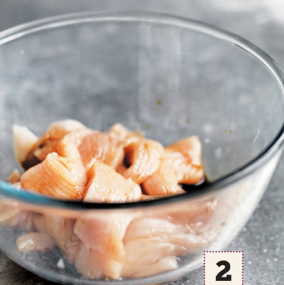 - 2 skinless, boneless chicken breasts, about 300 g/10½ oz total weight, cut into 3-cm/1¼-inch strips