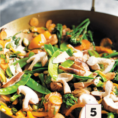 - Add the orange pepper, spring onions, carrots, broccoli, mangetout and the remaining groundnut oil to the wok and stir for 1–2 minutes, until coloured and soft. Add the sauce, stir again and leave it to bubble up for 1–2 minutes.