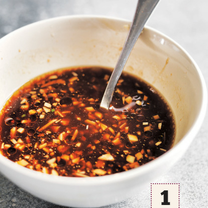 To make the sauce, crush the garlic with the flat of a large knife. Put the garlic and ginger in a small bowl with the tomato ketchup, oyster sauce, soy sauce, stock and sesame oil. Stir well to combine and set aside.