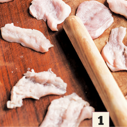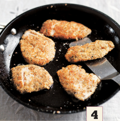 Diagonally slice each chicken breast in four length ways to make 12 escalopes. Place each escalope on a chopping board and pound it a few times with a rolling pin to a thickness of about 1 cm/½ inch.- Put the beaten egg in a shallow dish and put the breadcrumbs in a separate shallow dish. Stir the thyme and oregano into the breadcrumbs.