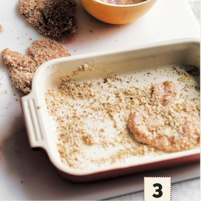 Coat each escalope in egg, then hold it above the egg dish to allow the excess to drip off. Dip into the breadcrumb mixture, turning to coat, then transfer to a large plate.