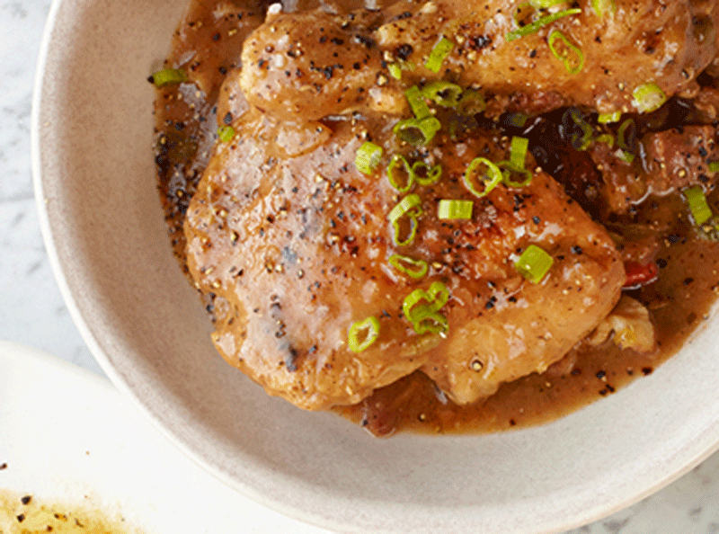 - Add the celery, bell pepper, and onion and cook until slightly softened, about 3 minutes. Add the garlic, tomato paste, thyme, and cayenne and cook until the garlic is fragrant, about 1 minute. Add the white wine (if using) and bring to a boil. Whisk in the stock and bring to a simmer. Add the bay leaves and okra and return the chicken and sausage to the pot. Simmer briskly until the chicken is tender, about 45 minutes. Remove the bay leaves. Stir in the Worcestershire and reserved bacon, season with salt, sprinkle with the scallions, and serve.