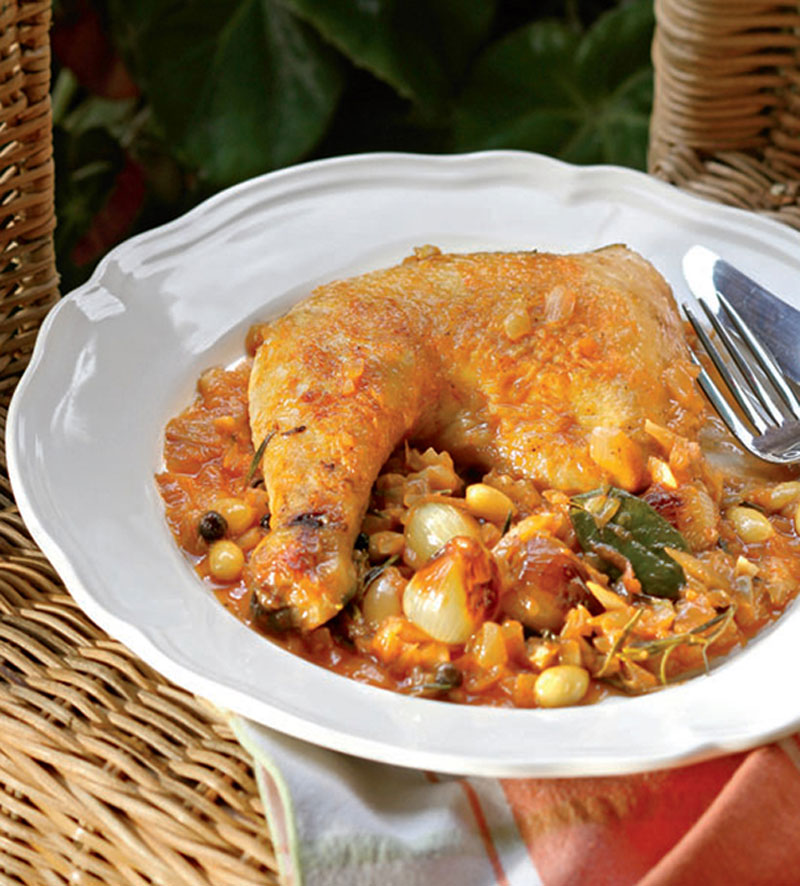 - Twenty minutes before removing the chicken from the heat, gently stir in the whole onions, the almonds, and the vinegar.