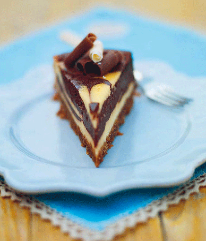 - Spoon half of the dark chocolate mixture over it, cover with the rest of the light mixture, then spoon the rest of the dark one on top.