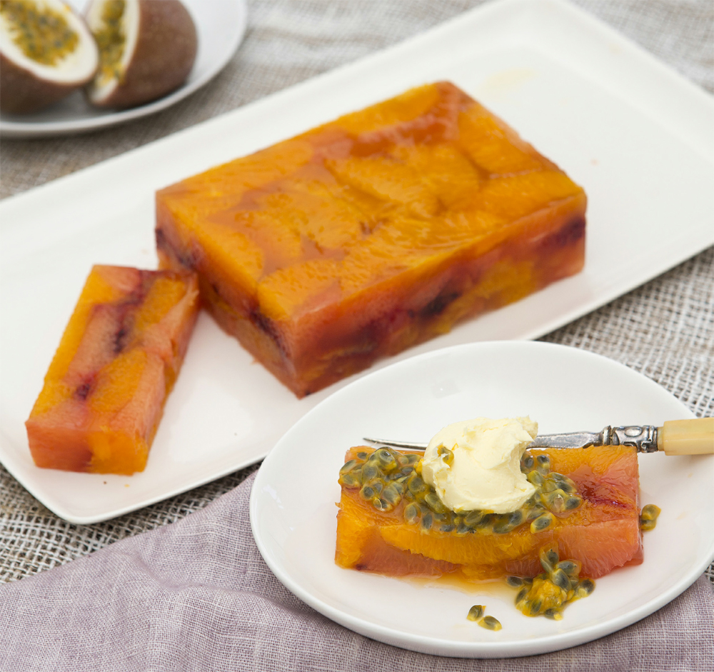 This is such an elegant dish for a special occasion when you have the fabulous colours of blood oranges and pink grapefruit to work with. The terrine is infused with the unique flavour of passionfruit as the jelly is made with its juice, then extra pulp spooned on top for texture. Working with gelatine becomes second nature after a bit of practice, enabling seasonal fruit to present so beautifully. Segmenting the citrus fruit will take some time so this is one to keep for a quiet day or enlist willing helpers!