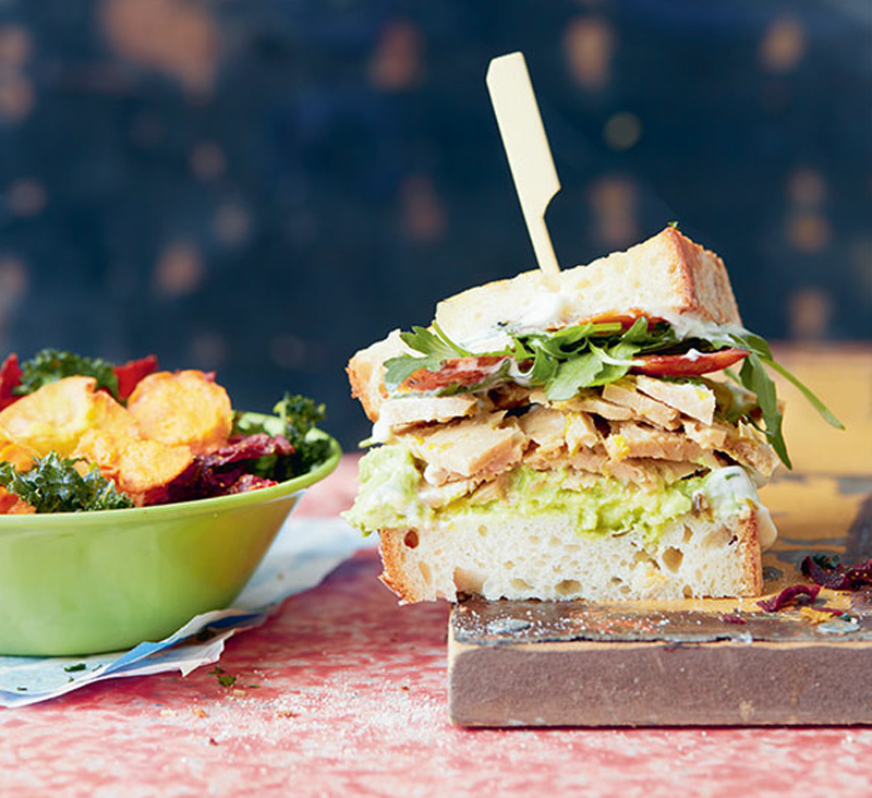 - In a small frying pan/skillet, add the oil and put over a high heat. Add the rashers and fry quickly to brown slightly. Remove and set aside. In a small bowl, mix together the mayo, lemon juice and garlic. Toast the sourdough, then spread the bottom slices with avo mash, add a couple of slices of the chkn roll, and top with rocket/arugula, then a couple of rashers. Drizzle with the mayo, and top each with another toasted slice of sourdough.