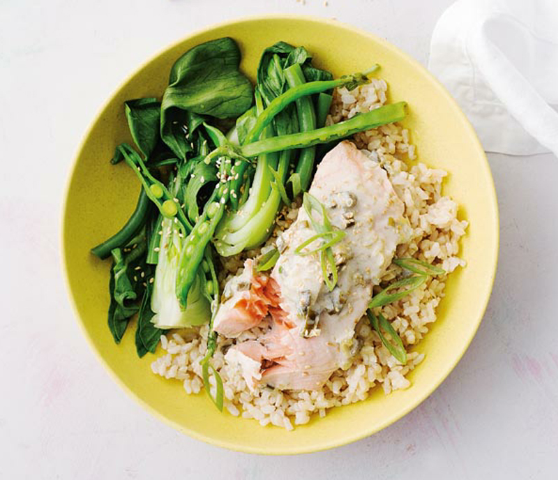 - To serve, place the rice in two bowls and top with the salmon fillet and steamed greens. Spoon over the coconut sauce and sprinkle over the sesame seeds.