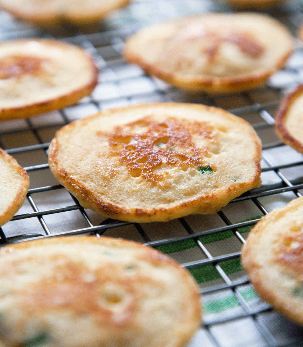 These small cornmeal “pancakes” are beautiful, sturdy hosts for the likes of thinly sliced prosciutto or smoked salmon with creamy herbed cheese or a flavored mayo.