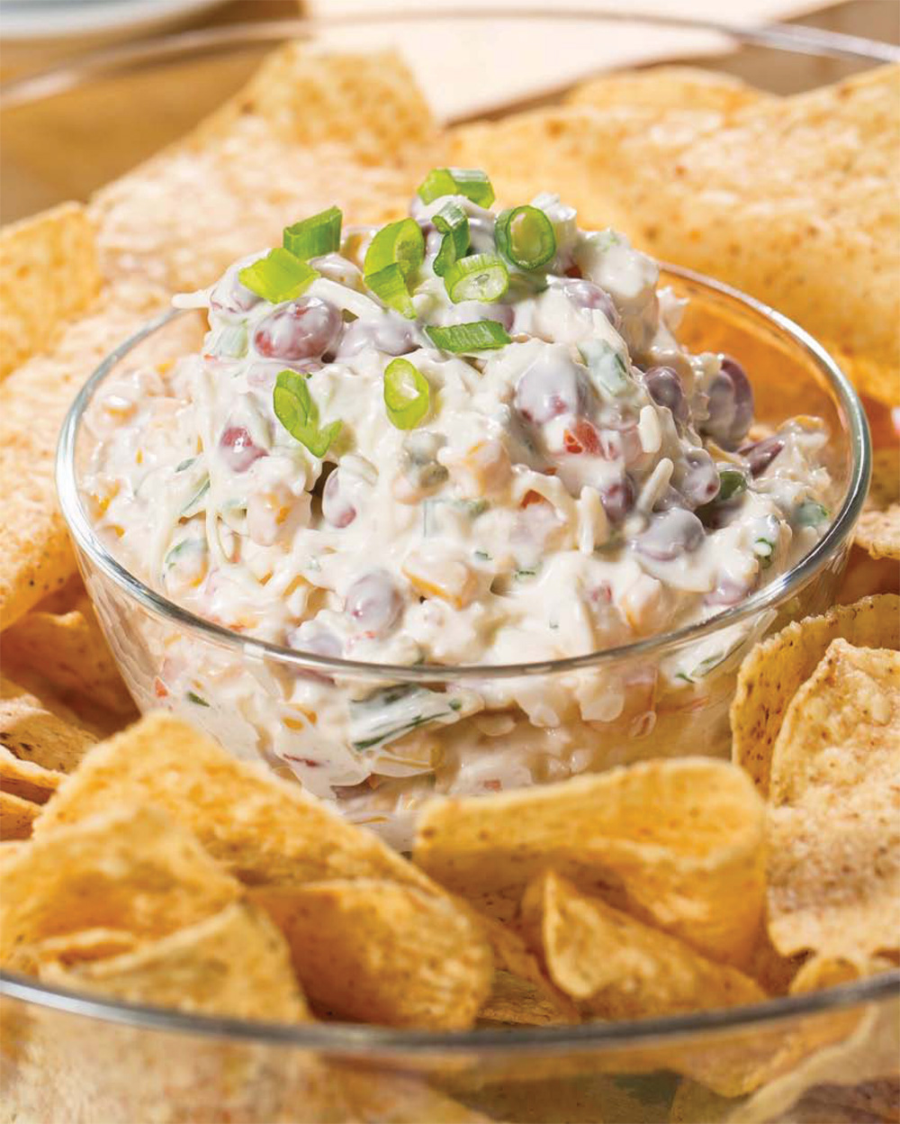 - Mix together all ingredients except chips in a 13"x 9" glass baking pan or serving bowl. Cover and chill; may be kept refrigerated for several days. Serve with warm pita chips or tortilla chips.