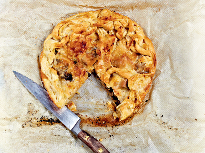 The croustade (also known as tourtière) is a popular Bordeaux treat, comprising layers of thin pastry sandwiching apples or prunes and doused with a sugary Armagnac syrup. My version uses some salty and creamy blood sausage, which marries beautifully with the tartness of apple.